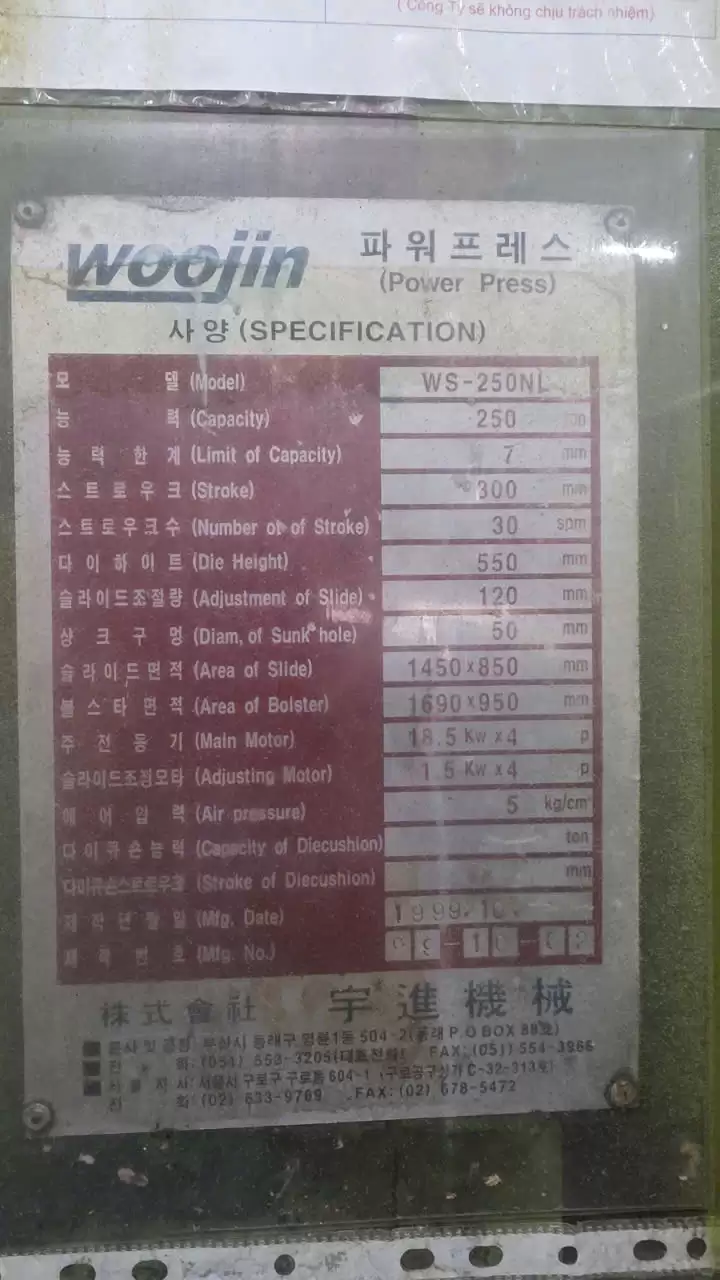 유압 프레스 250톤 (모델 WS-250 Woojin )